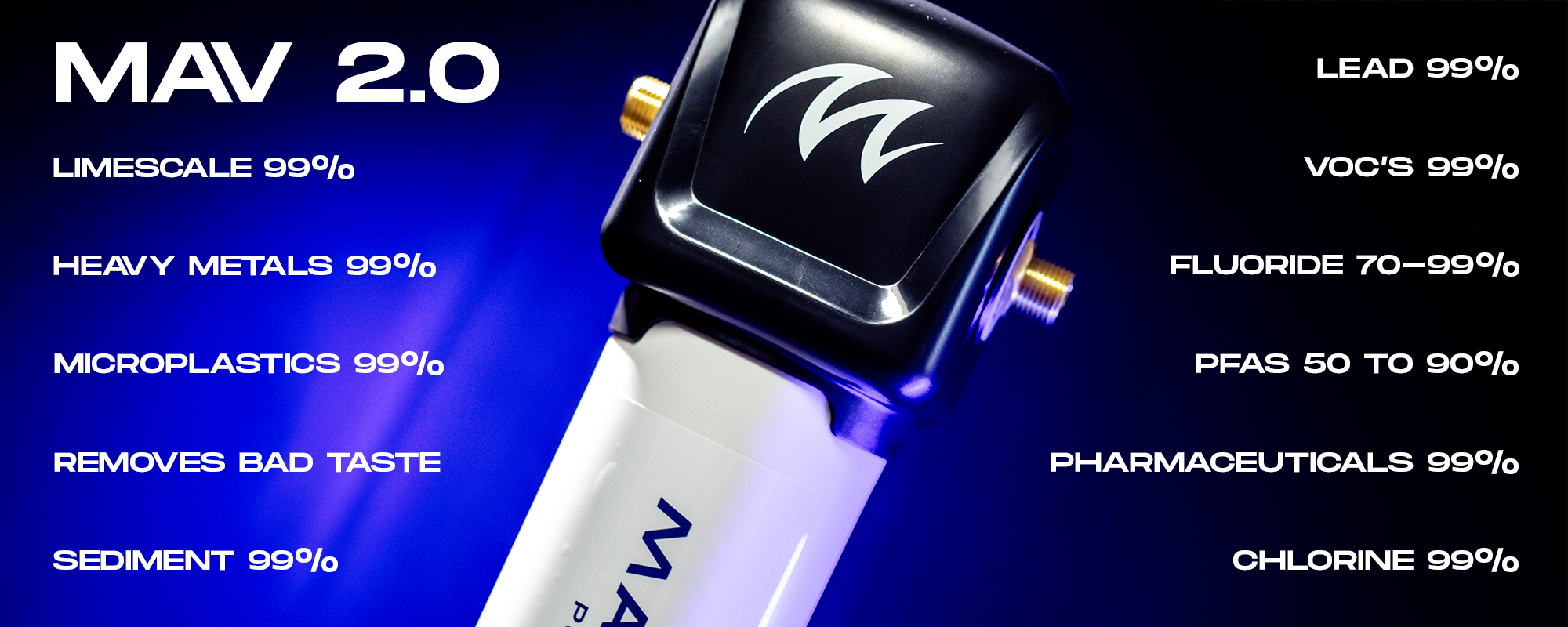 Maverick Pure Water Filter reduces harmful impurities, including chlorine, lead, fluoride, VOC’s, viruses,