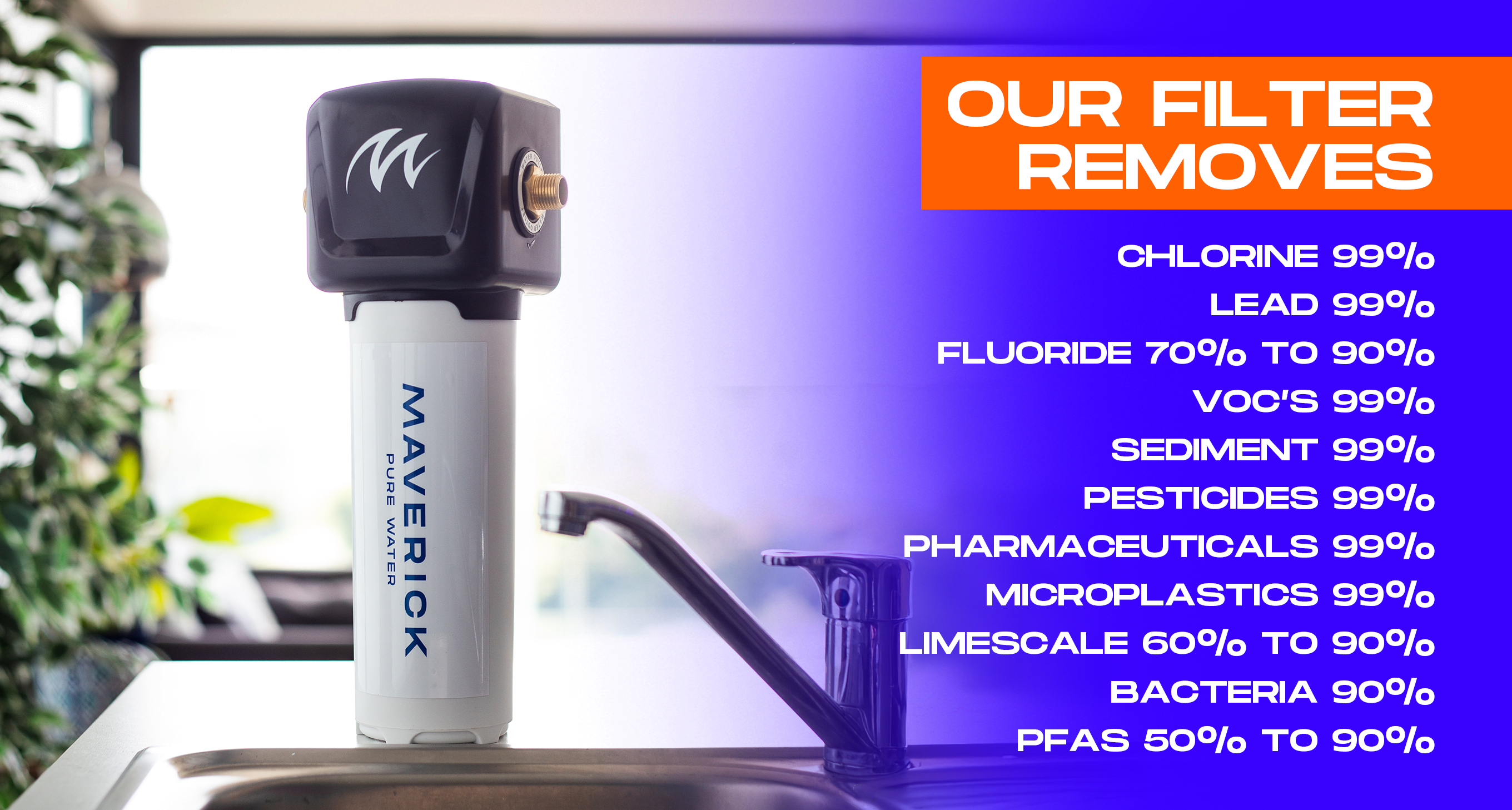 Maverick Pure Water Filter reduces harmful impurities, including chlorine, lead, fluoride, VOC’s, viruses,